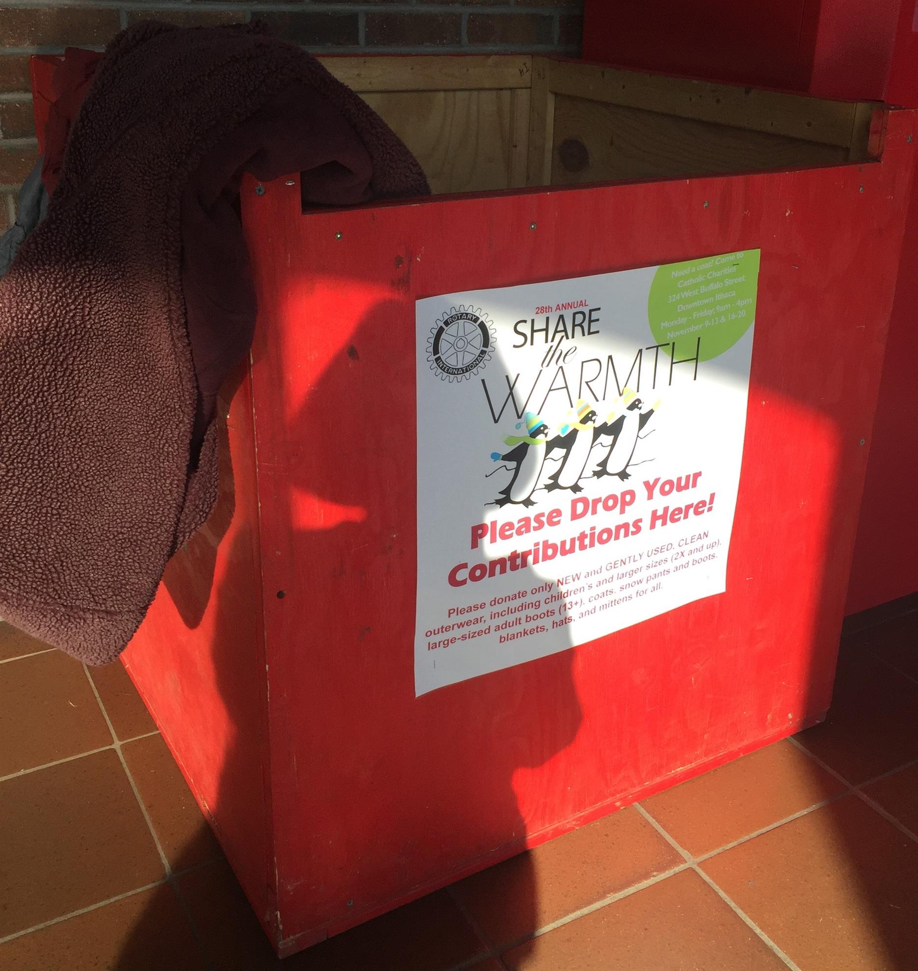 Help spread warmth this winter! The Ithaca Rotary Club’s 33rd annual Share the Warmth campaign is now underway, collecting new and gently used winter clothing across Tompkins County through November 24. Find a red collection bin near you and make a difference for neighbors in need this season.